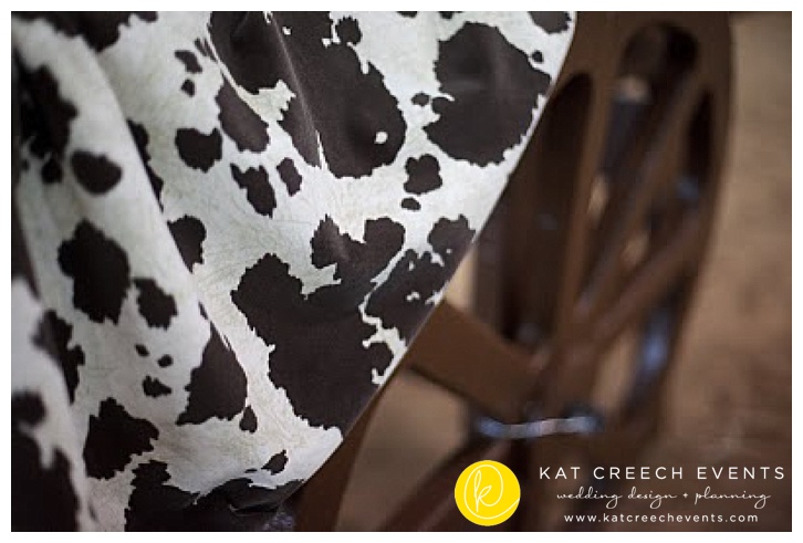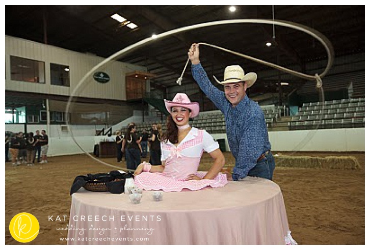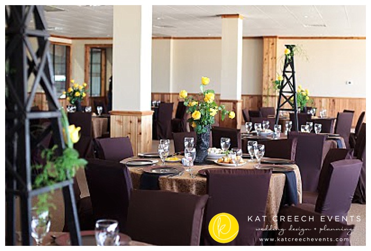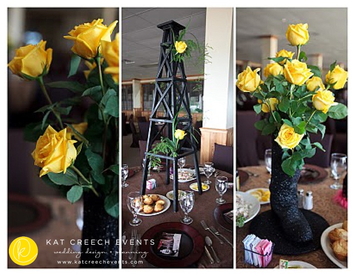 The upstairs event space overlooking the main horse arena was filled with natural sunlight providing a great backdrop to honor the guests. With beautiful leather overlays, chocolate fitted chair covers, and mahogany chargers; the foundation was complete to add the centerpieces of glitter black boots and tall oil derricks. And a Texas theme would not be complete without the Yellow Rose.