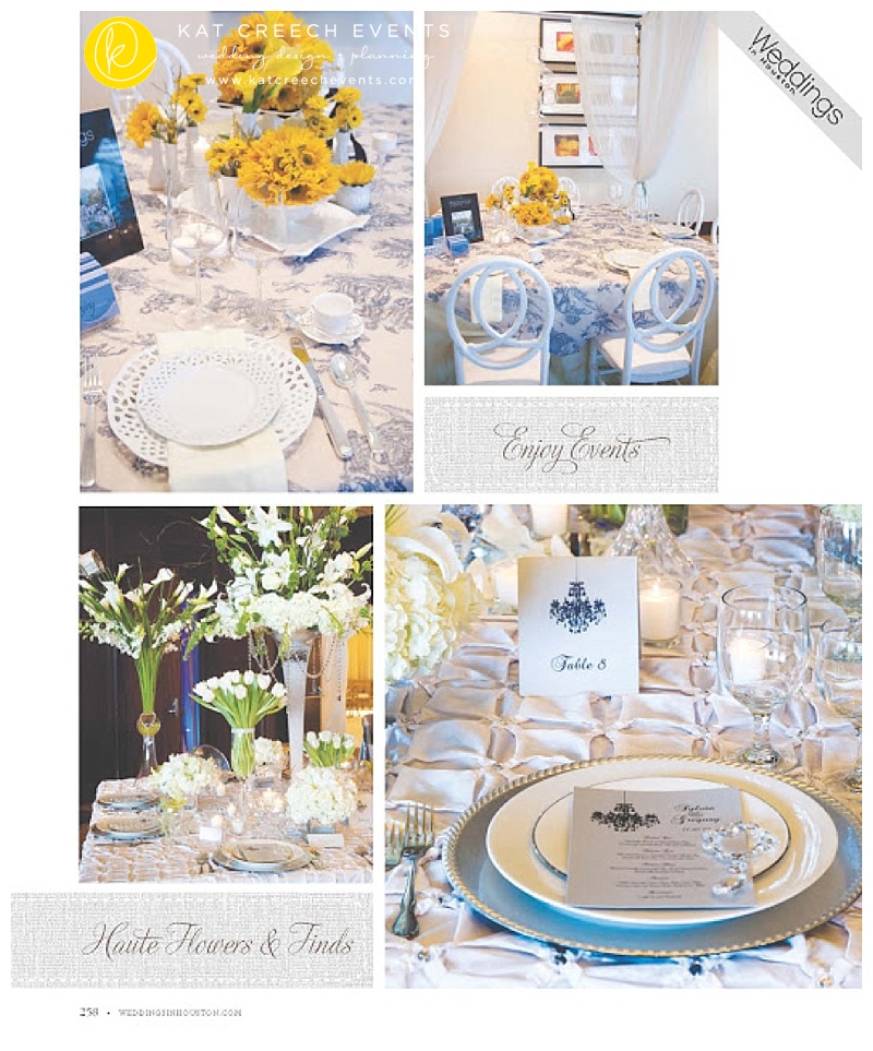 Weddings in Houston magazine is one of the top resources for brides in the Houston area. We are honored to be featured in the latest Weddings in Houston edition showcasing a table design at the I Do Bridal Soirée. The I Do Bridal Soirée took place at the InterContinental Hotel in the Galleria. As one of the few vendors invited to participate in the table design area, we wanted to put together something special. The design was inspired by one of our favorite clients celebrating her wedding day later this month. Just a small sample of what we have in store for Becky & Trevor. Keep a lookout for their own blog to see what this sample only hints at.