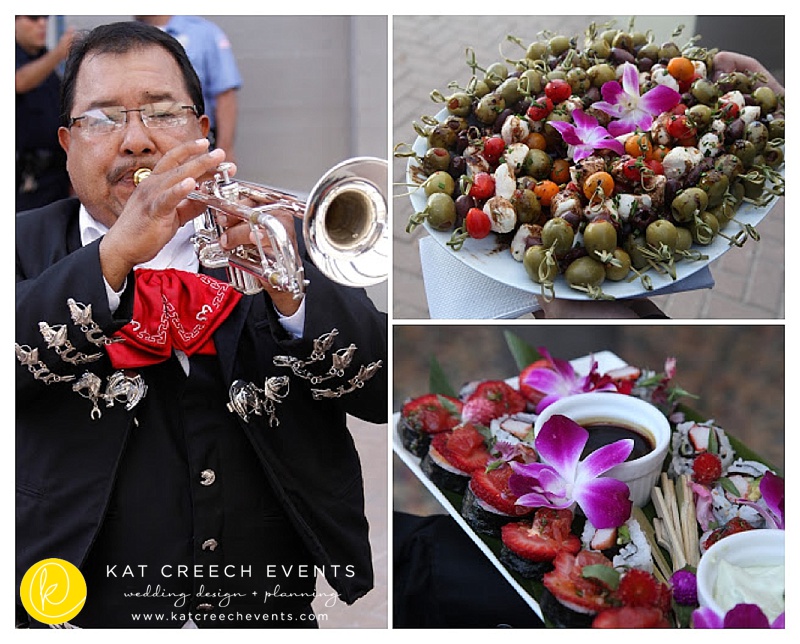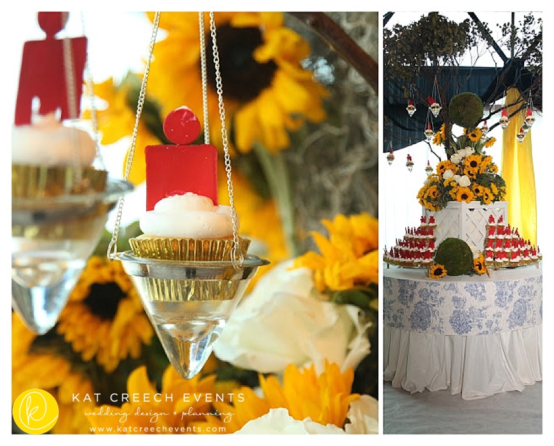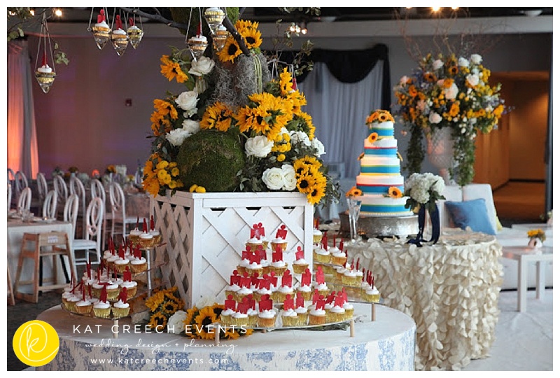 There is something surreal about being married in your childhood church… …and experiencing the moment when you are able to exhale. There is just something great about unique guest books. This one will allow Becky + Trevor the opportunity to read little notes left behind by dear friends and family for many, many years. There is just something about a refreshing lemonade stand on a hot summers day. It gets a bit better when you display it on a modern table with a blue French toile inlay. Now, that is refreshing. There is just something about cultural experiences:: mariachi, caprese skewers, and strawberry sushi rolls. Ways to get the party started. There is just something about Breath-taking moments. Nothing. Better. Too much toile is not a good thing. There is just something about the perfect amount, creating a classic table seating, leads to perfection. Pair it with the perfect modern chair and it is flawless. There is just something about being dramatic and the love for a family style table. Double-Dramatic: hollow circular tables with beautiful manzanita trees and floral accents in the center. All finished off with toile runners and some incredible floral with eclectic containers. There is just something about celebrating who we are as well as the experiences that shape us. It is essential in all great things. Worldly travels influenced table numbers, which leads to reflection; regional food and beverage embraces the essence of what shapes us; and great family and friends bring it all together. There is just something mind-blowing when a simple sketch becomes reality. There is just something epic when the design is even more than you can dream. There is just something unexplainable about the moments that were about to happen under a ribbon ceiling treatment, finished off with sunflower balls. There is just something about a grand display. There is just something unique about finding inspiration in a simple kitchen bowl and designing your wedding cake with it in mind. There is just something about your love for the Iron Man and Tres-Leches. Tres-Leches cupcakes can be done. When there is a will, there is a way. There is just something about flawless furniture and a fantastic-floral-masterpiece.