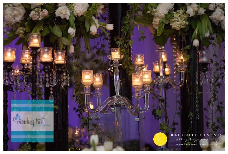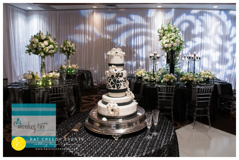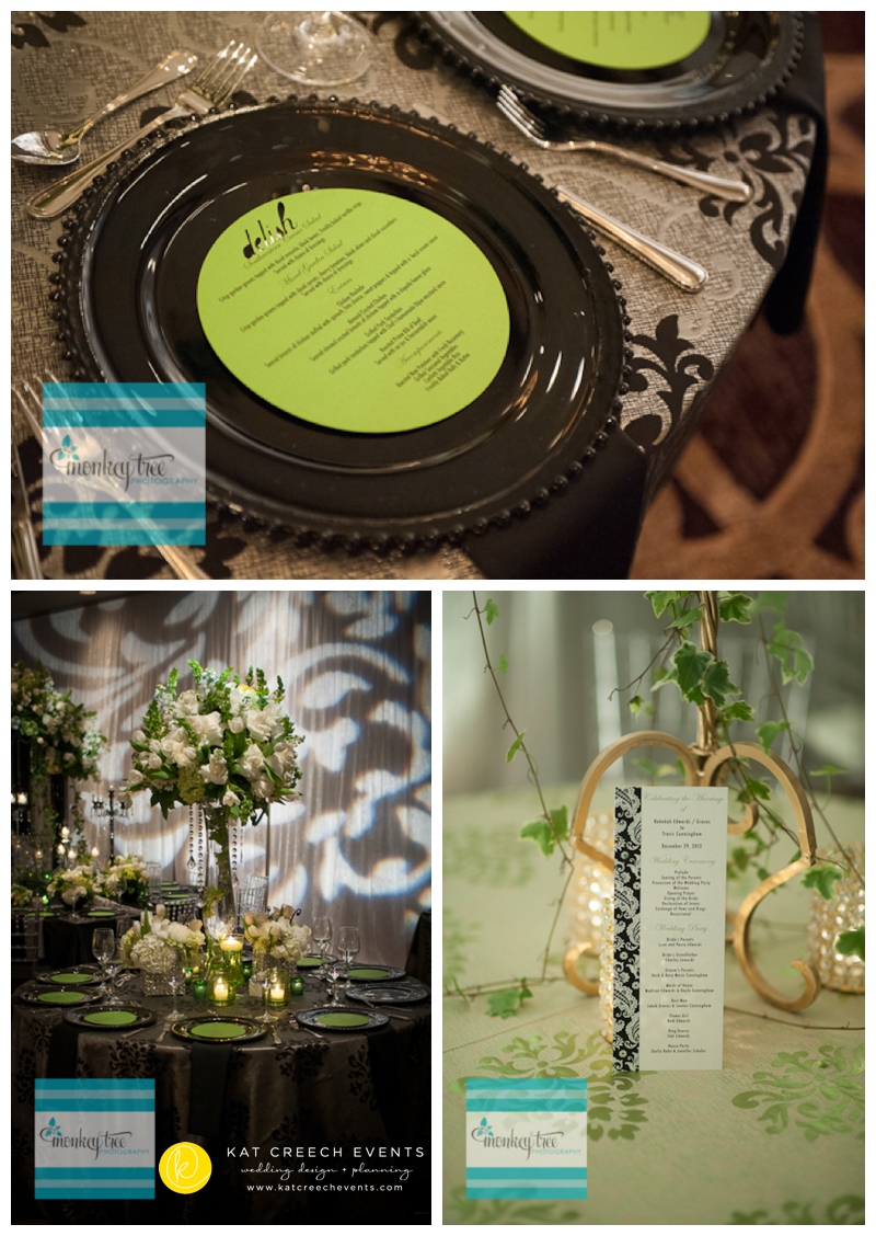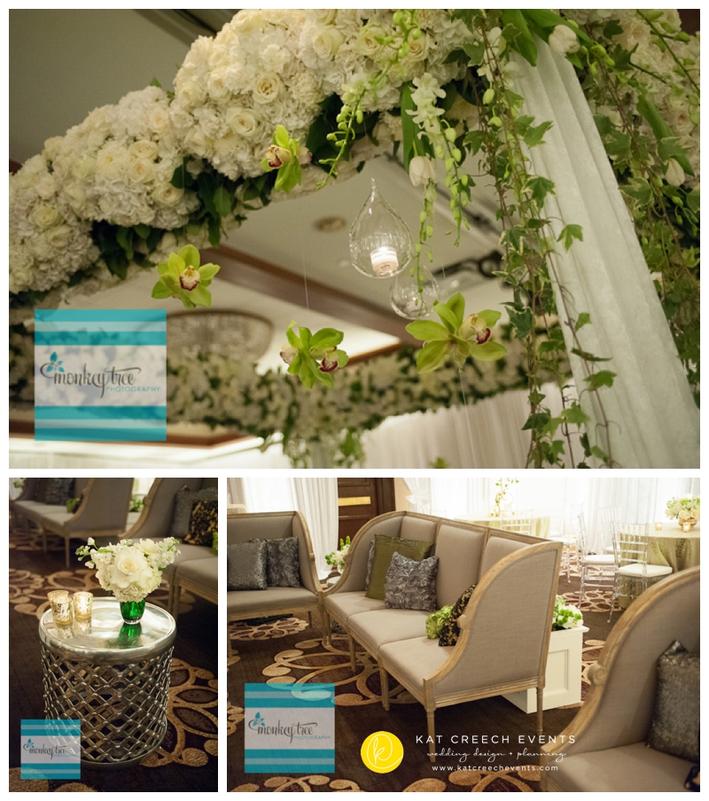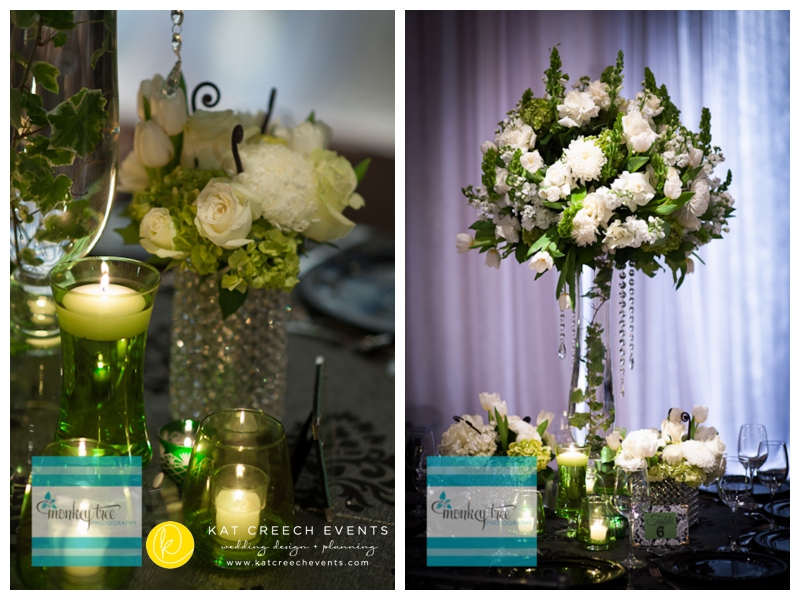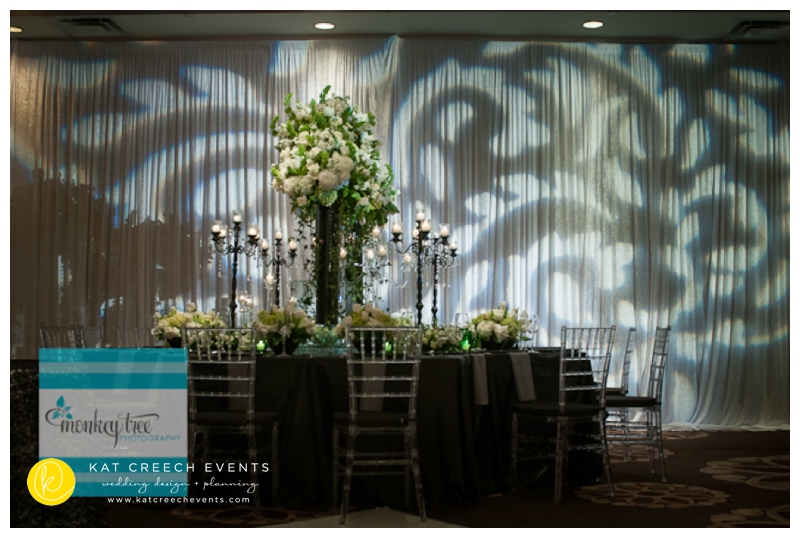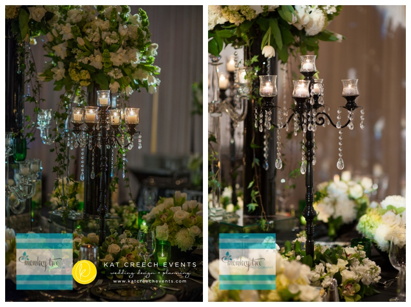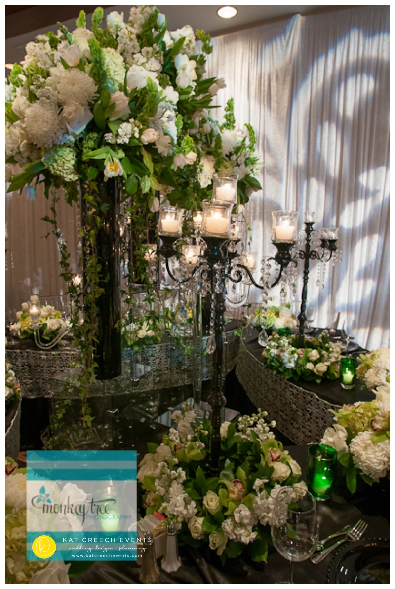 Rebekah and Travis’ modern wedding of black, white, and green was the scene for this wedding playground. The clean, crisp lines created a fresh look and was elegant against the backdrop of black accents. But, this is not the whole story. It is really the beginning of the next chapter to an already impressive story. It started with childhood friends who lost track of each other only to have fate find them together twenty years later. While years might have passed, they picked up where they left off and they reconnected instantly. The rest as they say is history, and they lived happily ever after. Rebekah, owner of Dream Bouquet, and I are not only great colleagues, but have forged a friendship over the years. We have had many a playground to play on, creating epic designs for our brides. I was beyond honored when she looked to me to handle the event planning and production of her wedding. As everyone knows, I like crazy ideas, and love to make them into reality. Rebekah + Travis’ celebration of love was to be no different ( other than the added pressure of throwing a party for all the who’s who in the wedding industry honoring one of the most sought after floral designers in Houston). It started with a ceremony masterpiece with a color palette of ivory and gold, providing a soft candle glow with lounge furniture surrounding the cascading flower alter in the center of the room. There was not a bad seat in the house for this intimate gathering as they entered from opposite sides of the room simultaneously to meet in the middle. The highlight of this wedding was the production of Rebekah and Travis entering from opposite sides of the room while family heirlooms were showcased in a glass case at the alter. Rebekah shared that her favorite item among the family pictures and heirloom jewelry was the 1943 rolling-pin belonging to her great aunt and uncle, which was signed by their wedding guests when they were married. The wedding reception was indeed a showstopper and there was so much eye candy guests could not get enough. The guests were transitioned from an ivory and gold ceremony to an atmosphere of epic lighting with silver and black with accents of green. Lush flowers cascading down from the black triumph candelabras and patterned lighting accented every little detail. Breathtaking is about the only adjective I can use. The balance of whites and greens against the silver and black damask linen could not have been anymore perfect. More importantly, two families finally joined together to create one, and the room was complete with wonderful friends and family to celebrate the occasion. Indeed, one of the most epic weddings I have had the pleasure of being a part of. Kat Creech Events: event planning and production | Dream Bouquet: floral design | Anchor Entertainment: flip books | Brandit Bandits: stationary | Cakes by Gina: truffles | Elegant Beginnings: linens | Events in Bloom: lounge furniture | Hilton Houston Westchase: venue Impressions: bridal gown | Jos A Banks: suit | LG Entertainment: DJ/Lighting | Monkey Tree Photography: photography | The Prefect Face: hair + makeup | 3D Video: videography | Who Made The Cake: cake Related articles: Featured in Weddings in Houston Magazine