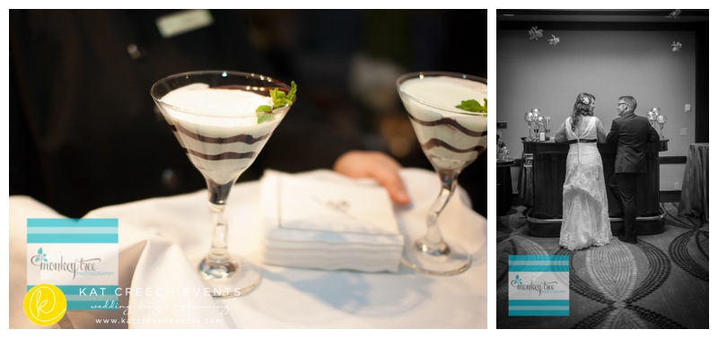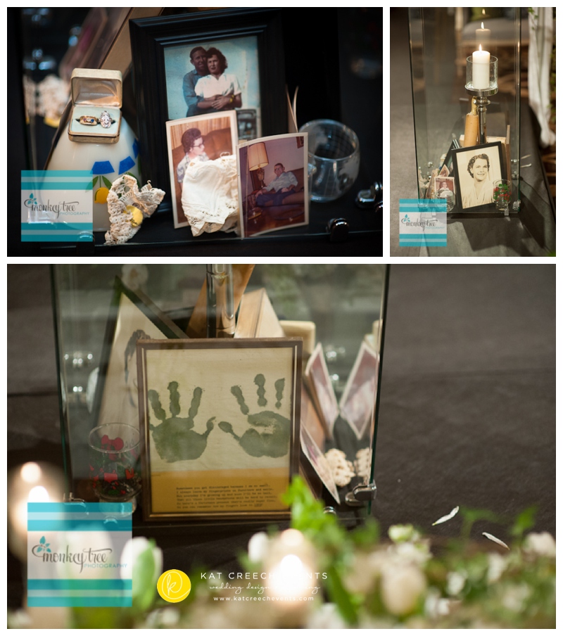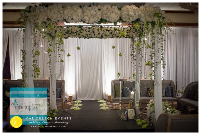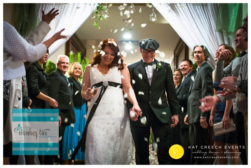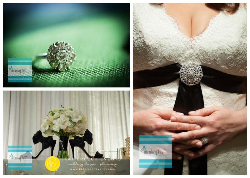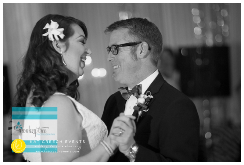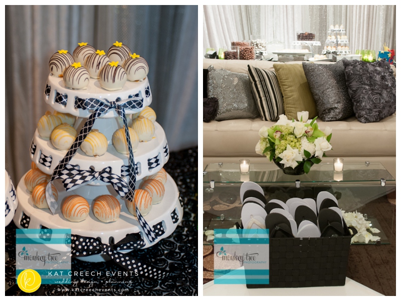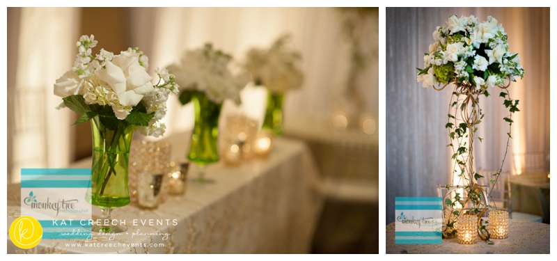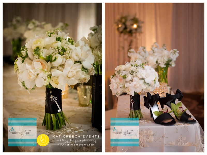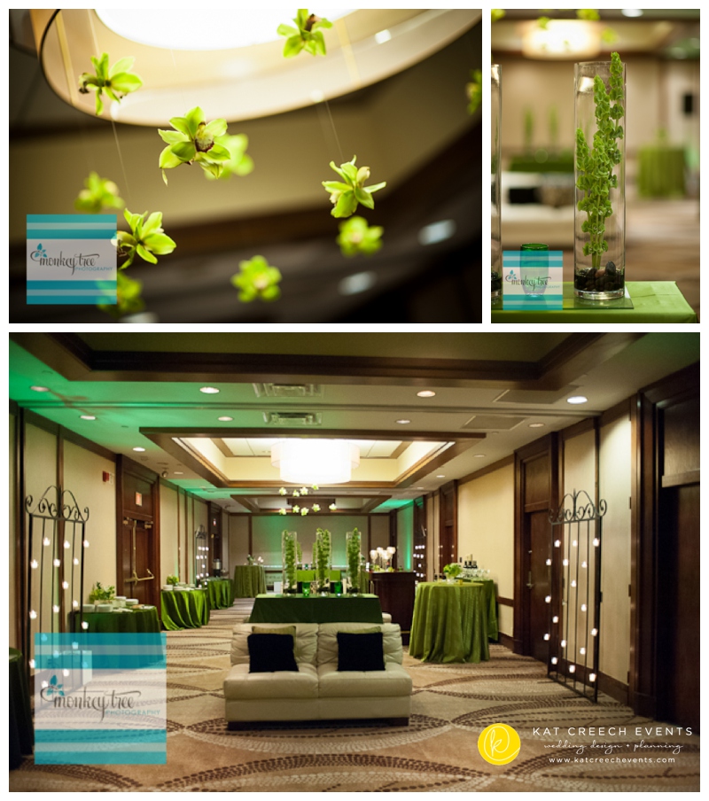 Rebekah and Travis’ modern wedding of black, white, and green was the scene for this wedding playground. The clean, crisp lines created a fresh look and was elegant against the backdrop of black accents. But, this is not the whole story. It is really the beginning of the next chapter to an already impressive story. It started with childhood friends who lost track of each other only to have fate find them together twenty years later. While years might have passed, they picked up where they left off and they reconnected instantly. The rest as they say is history, and they lived happily ever after. Rebekah, owner of Dream Bouquet, and I are not only great colleagues, but have forged a friendship over the years. We have had many a playground to play on, creating epic designs for our brides. I was beyond honored when she looked to me to handle the event planning and production of her wedding. As everyone knows, I like crazy ideas, and love to make them into reality. Rebekah + Travis’ celebration of love was to be no different ( other than the added pressure of throwing a party for all the who’s who in the wedding industry honoring one of the most sought after floral designers in Houston). It started with a ceremony masterpiece with a color palette of ivory and gold, providing a soft candle glow with lounge furniture surrounding the cascading flower alter in the center of the room. There was not a bad seat in the house for this intimate gathering as they entered from opposite sides of the room simultaneously to meet in the middle. The highlight of this wedding was the production of Rebekah and Travis entering from opposite sides of the room while family heirlooms were showcased in a glass case at the alter. Rebekah shared that her favorite item among the family pictures and heirloom jewelry was the 1943 rolling-pin belonging to her great aunt and uncle, which was signed by their wedding guests when they were married. The wedding reception was indeed a showstopper and there was so much eye candy guests could not get enough. The guests were transitioned from an ivory and gold ceremony to an atmosphere of epic lighting with silver and black with accents of green. Lush flowers cascading down from the black triumph candelabras and patterned lighting accented every little detail. Breathtaking is about the only adjective I can use. The balance of whites and greens against the silver and black damask linen could not have been anymore perfect. More importantly, two families finally joined together to create one, and the room was complete with wonderful friends and family to celebrate the occasion. Indeed, one of the most epic weddings I have had the pleasure of being a part of. Kat Creech Events: event planning and production | Dream Bouquet: floral design | Anchor Entertainment: flip books | Brandit Bandits: stationary | Cakes by Gina: truffles | Elegant Beginnings: linens | Events in Bloom: lounge furniture | Hilton Houston Westchase: venue Impressions: bridal gown | Jos A Banks: suit | LG Entertainment: DJ/Lighting | Monkey Tree Photography: photography | The Prefect Face: hair + makeup | 3D Video: videography | Who Made The Cake: cake Related articles: Featured in Weddings in Houston Magazine