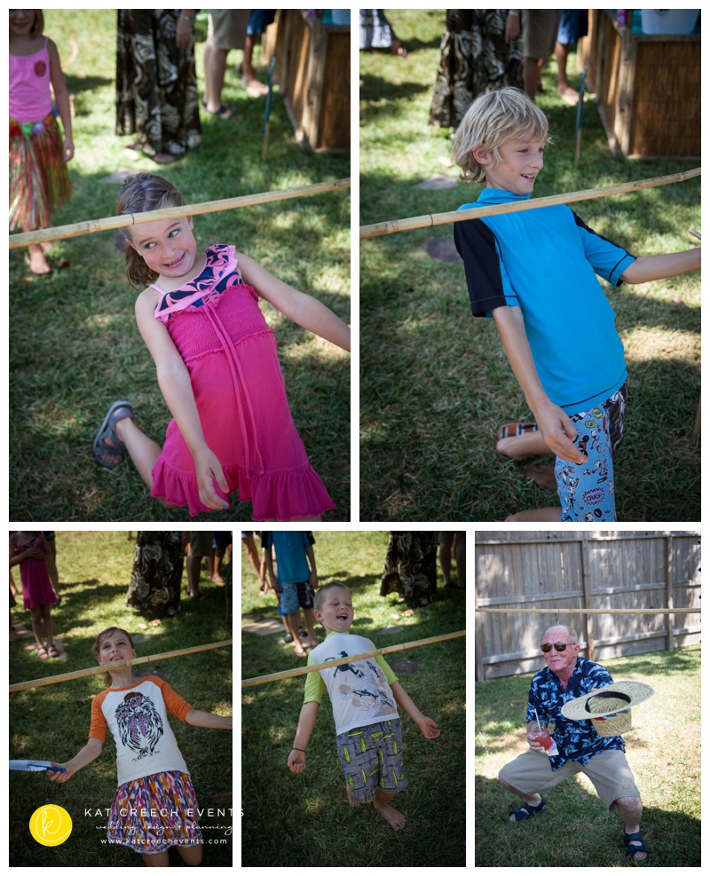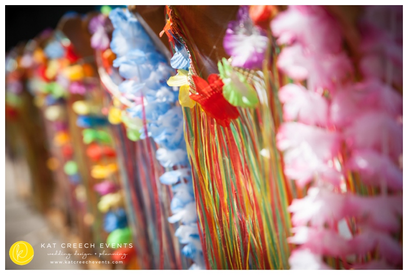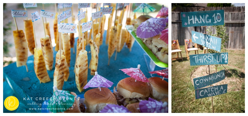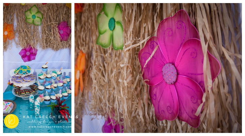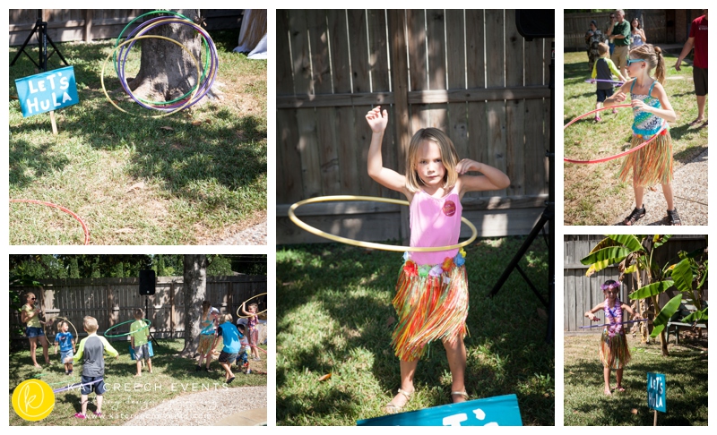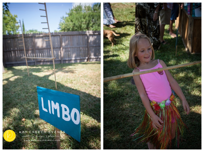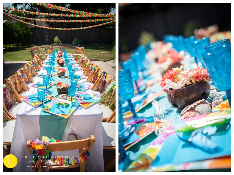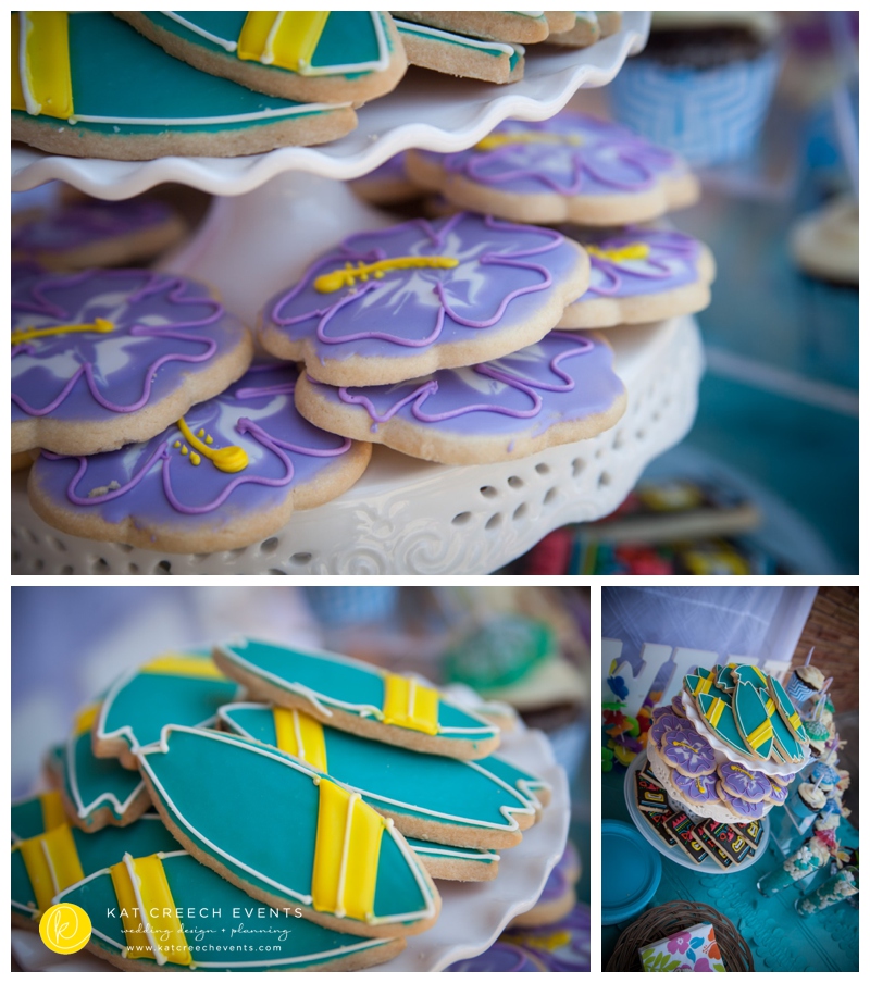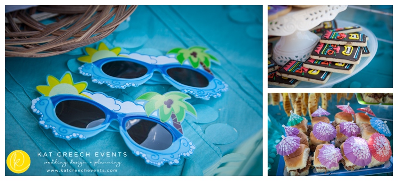 Madison + Austin celebrated eight and four with a luau themed birthday party filled with so many little details, you might have felt like you were transported to the big island. The family-style table accented with leis, hula skirts, and tiki goblets paired with surf boards and shades was just the right touch. While guests enjoyed the feast, which included mini pulled pork sandwiches, grilled pineapple, watermelon-feta skewers, mango-pineapple bruschetta, and fruit cups there was a fabulous Tiki Bar with traditional Mai Tai’s and Kona brew to quench your thirst. The dessert spread {our favorite part} was a all about the chocolate-chocolate cupcakes and decorative cookies from Michael’s Cookies Jar. For the Luau fun, there was directional signage and stations to enjoy. From coconut bowling to limbo and from hula to enjoy the “beach” {pool} it was le’ale’a ho’ohoaloha “good times with good friends.” The ladies even performed a traditional hula dance pool side. Too funny! The party advice: details, details, and details….it makes all the difference in any party. Spending a little time to create the accents is what I enjoy the most and is guaranteed to be loved by the party guests. Plus, it gets the kiddos involved and that is just fun! But, what really makes all the difference? Great friends! We are fortunate to have so many! kat creech events: event design, diy, food : | michael’s cookie jar: decorative cookies | darryl + co: tiki bar | elegant beginnings: linens | lg entertainment: dj | steve lee photography: photos