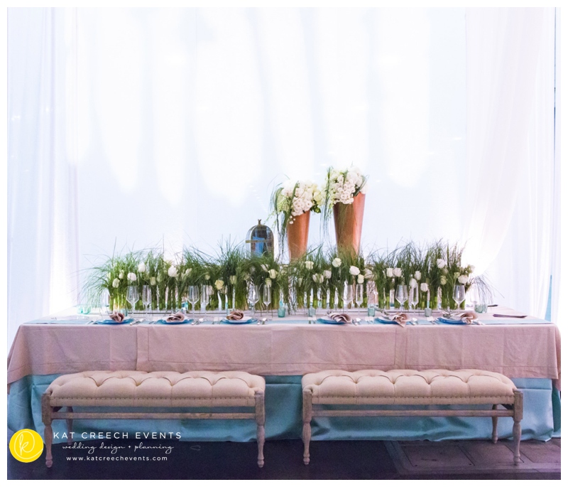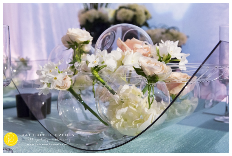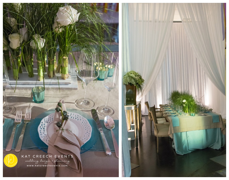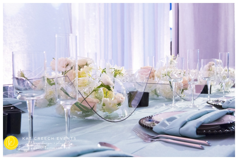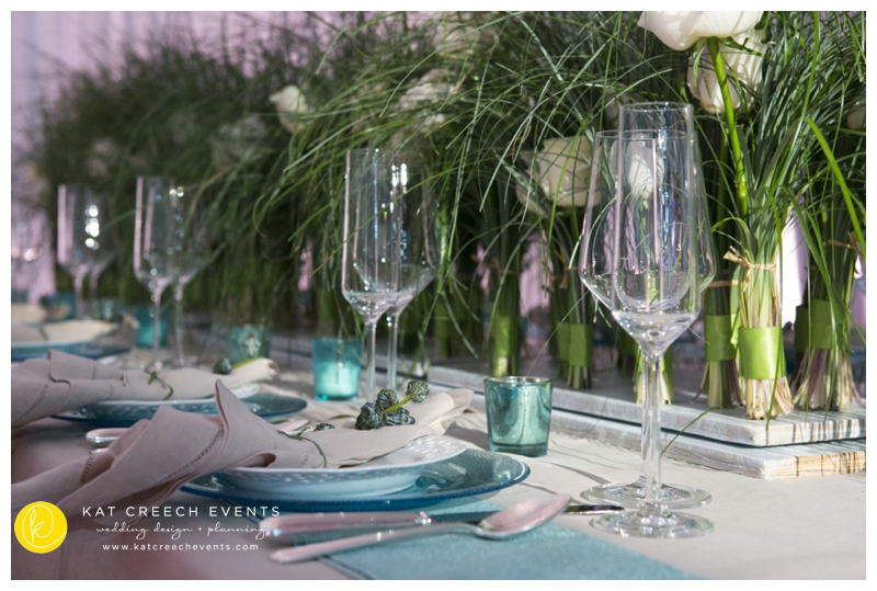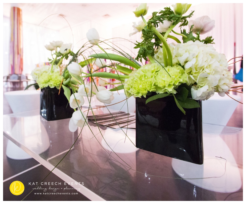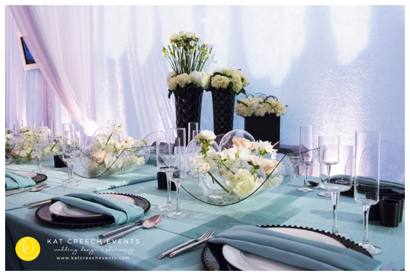 At the January show we paired up with LG Entertainment and Arteflora Design to design the Bridal Extravaganza Show Couture Lounge. Our clients all have a common dominator: to be unique and true to their personality while celebrating their love with friends and family.  So, together, we had a playground where we designed two spaces in one area: vintage and modern blended together with the color of tiffany. The vintage was soft hemstitch linen complemented with lattice china and eucalyptus balls.  The centerpiece was nothing better than free standing bouquets running the length of the table.  The modern brought together the drama of black and acrylic.  With the CB2 glass balls seen everywhere, it was fun to put them into a floral application, placed every so gently and held in place with monofilament.  A stunning art piece indeed.