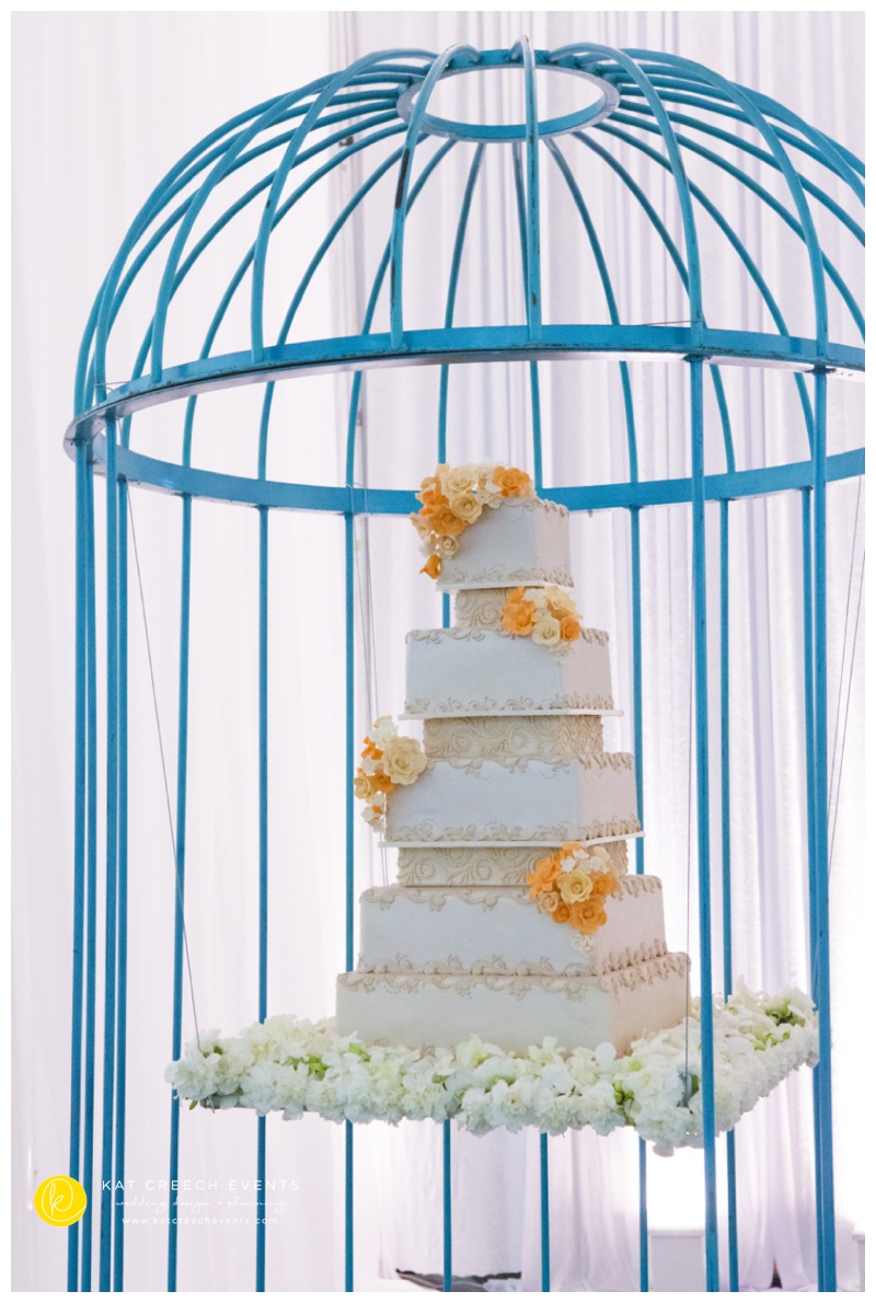 Finally, the cake is one of the most highlighted items at any wedding.  Many years ago, I came across this GoGo Cage and as with all designers, we never use an item for its original intention, and I knew some day I would suspend a cake from this 6′ beast. I saw a birdcage and a perfect tie-in to the vintage craze.  Nothing better than this beautiful cake from Who Made The Cake to complete the dream.
