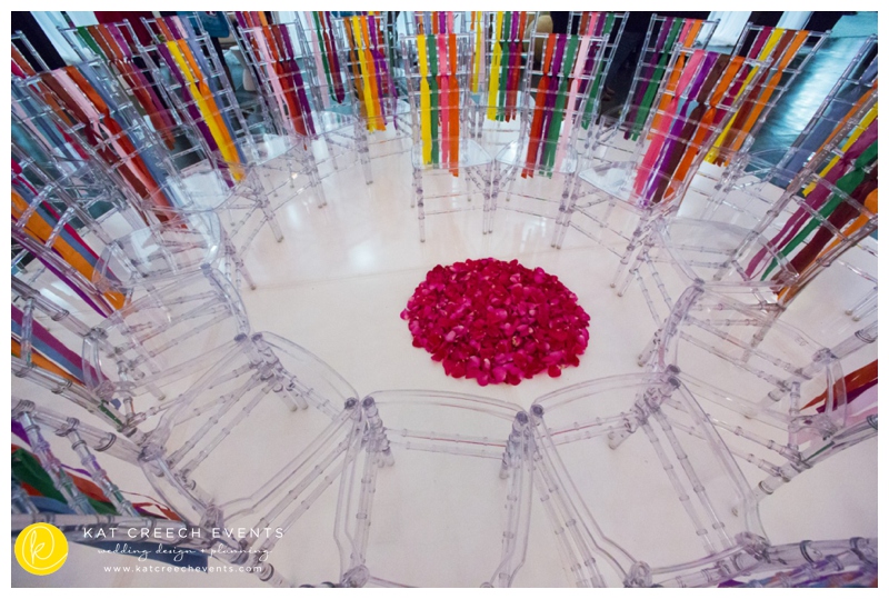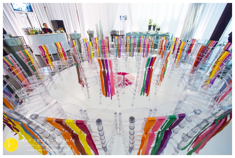The center of the design space brought together a white circle dance floor with beautiful acrylic chiavari chairs leading to the ceremony in the center.  The idea:  everyone has a front row seat to see the bride take her walk.  And, just because everyone needs a little color in their life, we did ribbon chairs in a variety of colors.